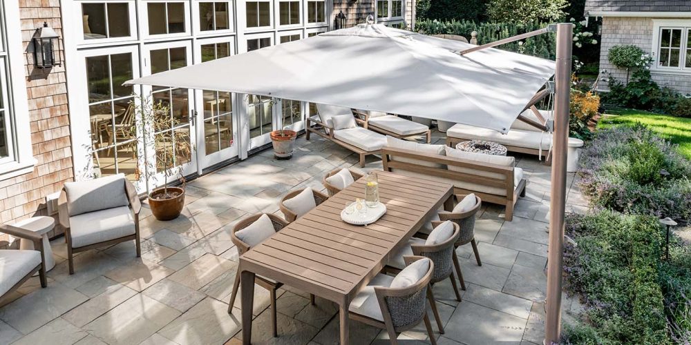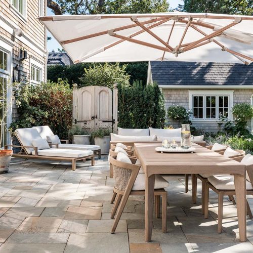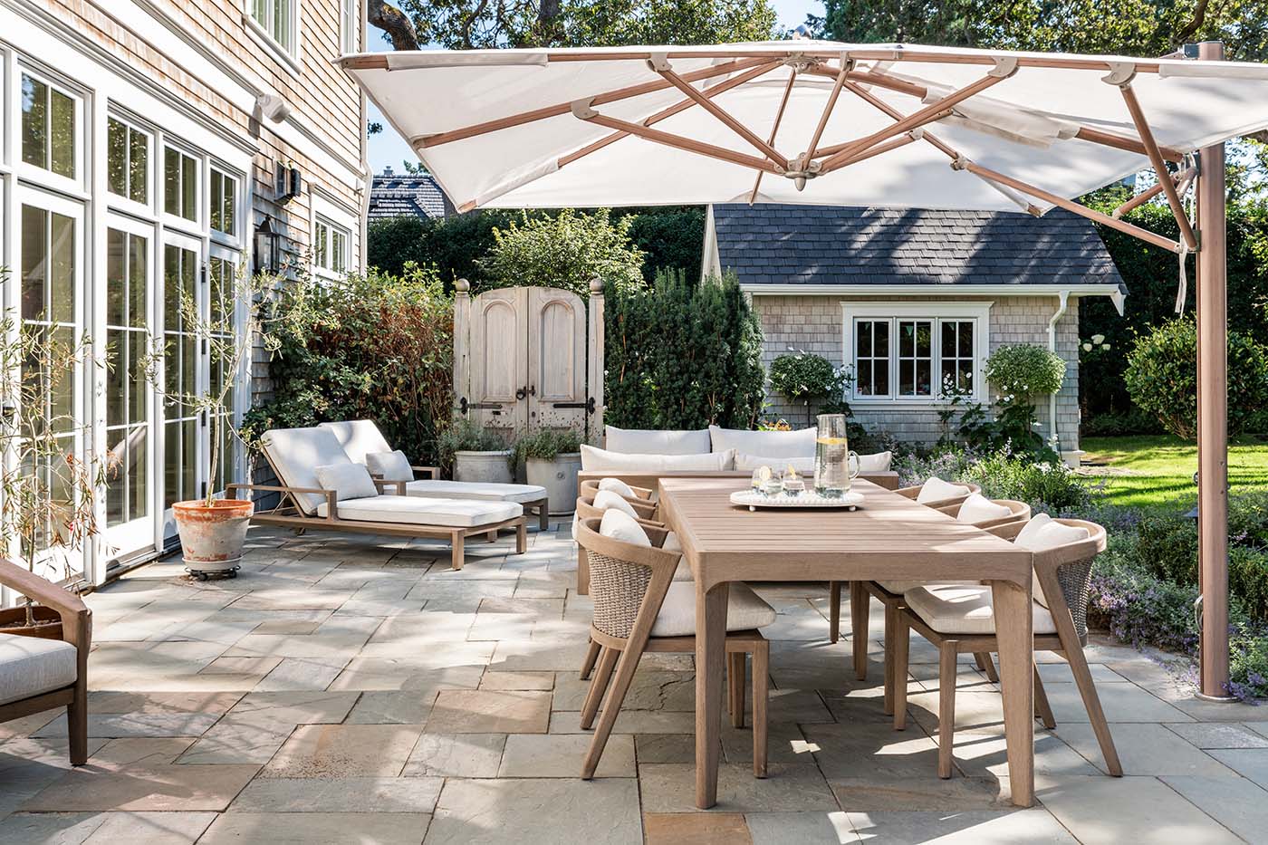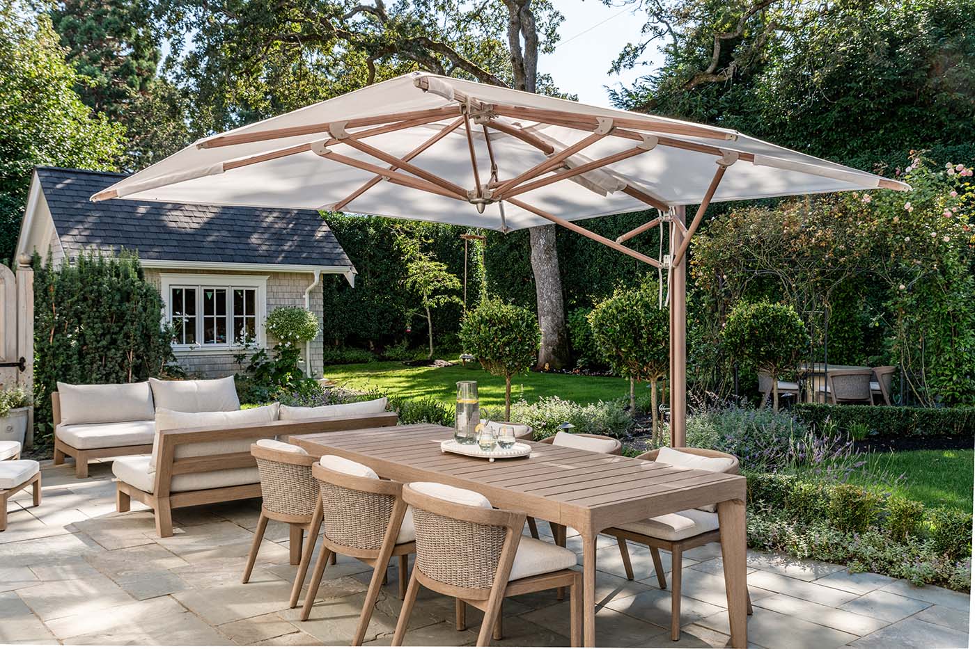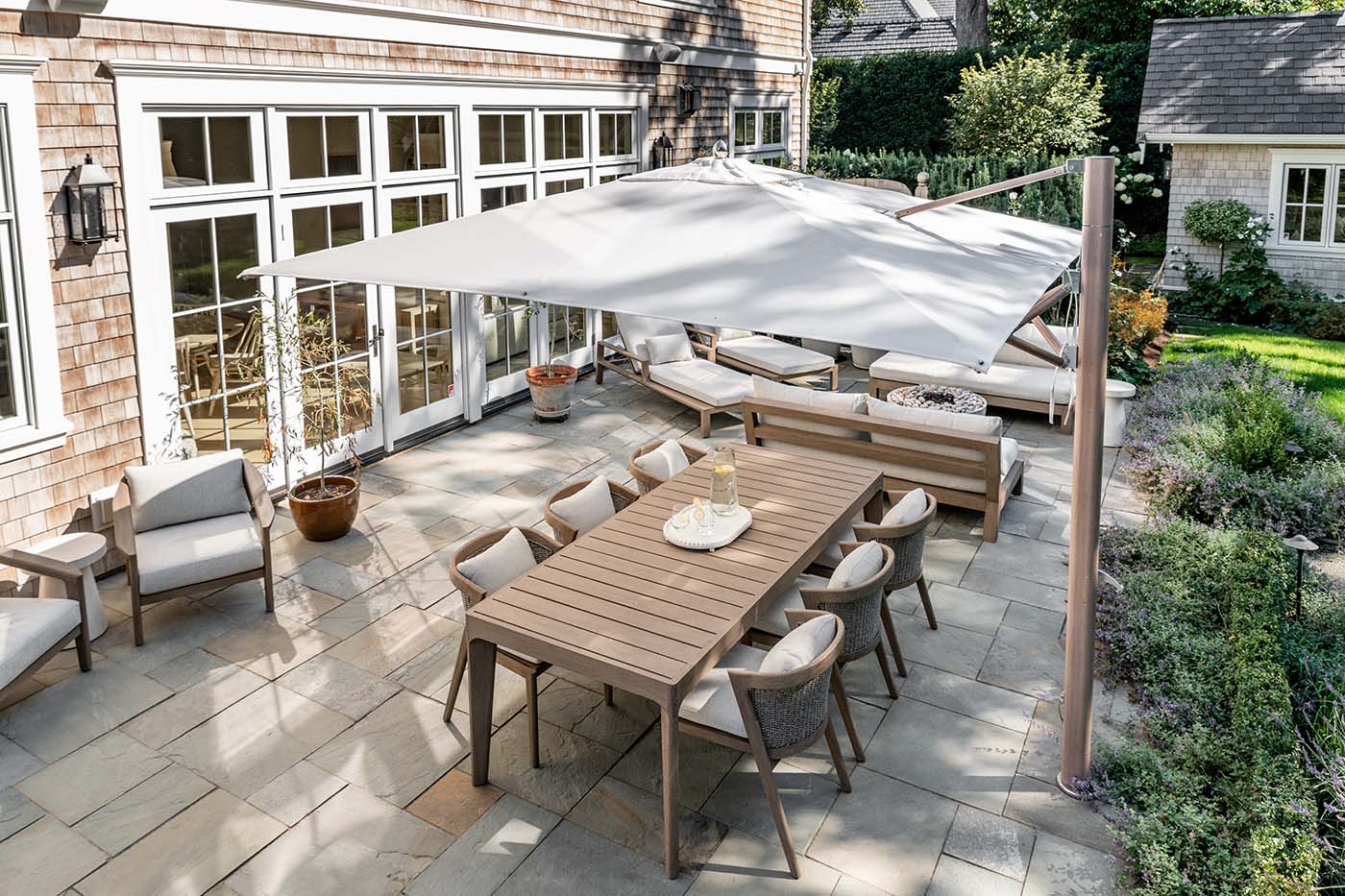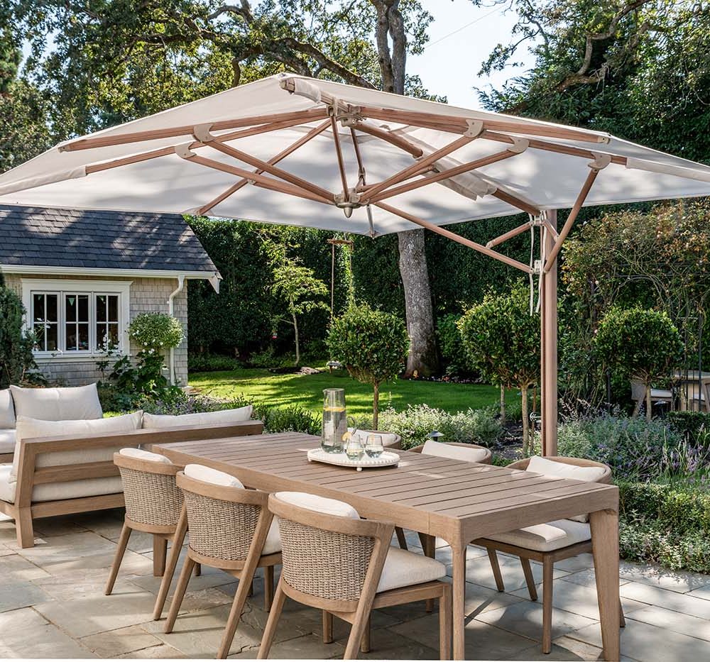 This outdoor kitchen is built to withstand over 30 years of exposure to saltwater and rain, enduring the elements every single day. Every component is crafted from aluminum or stainless steel, ensuring exceptional durability. At the heart stands a sturdy umbrella, serving as both a visual centrepiece and welcome shade for outdoor dining.