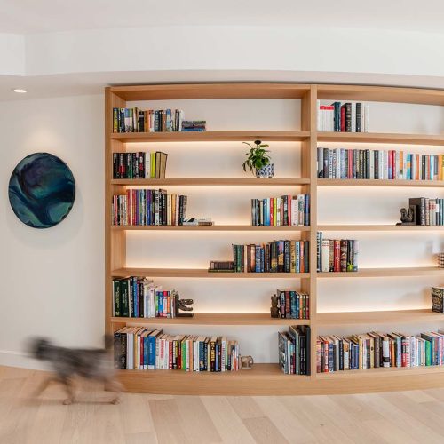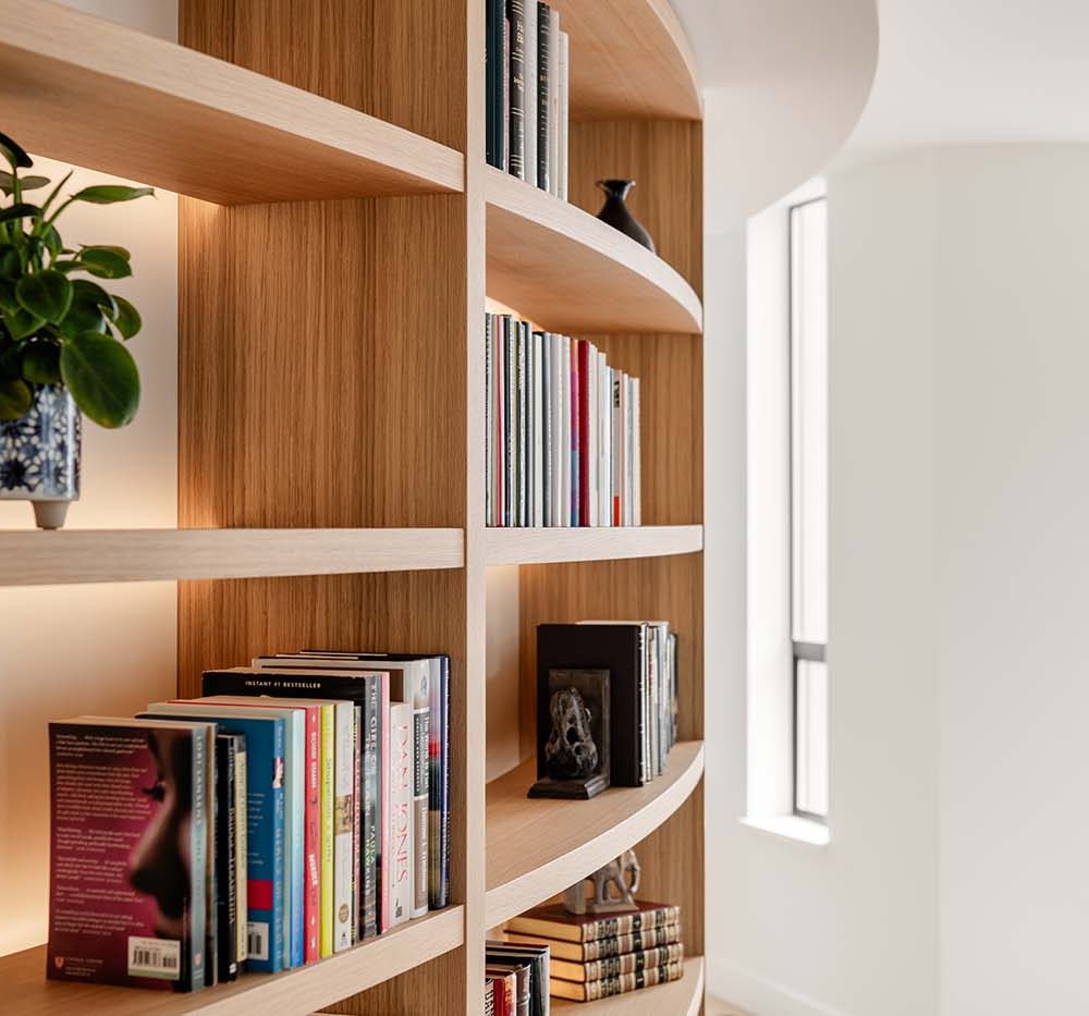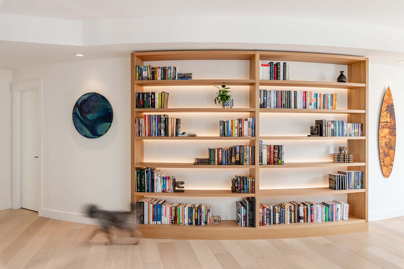 From the moment you walk through the front door, your eye is drawn to a custom white oak curved bookcase with backlit shelves — a striking focal point that immediately sets the tone. This dramatic entrance quickly leads to the expansive kitchen, which serves as the vibrant heart of the home. Every detail was thoughtfully addressed, leaving no stone unturned.
